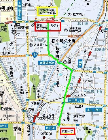 自転車の人は、河原町今出川から河原町通(途中から下鴨本通に変わる)北上し、北山通に着いたら、少し右へ行った後、宝ヶ池通を少し北上すると右に見えます。